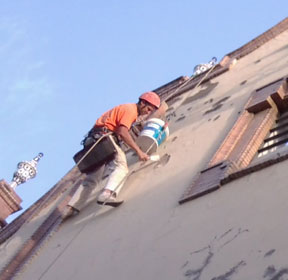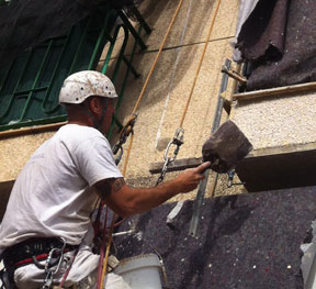 Rehabilitación de las cornisas, tratamiento pasivador, fijador, mortero fibrado y terminación monocapa.