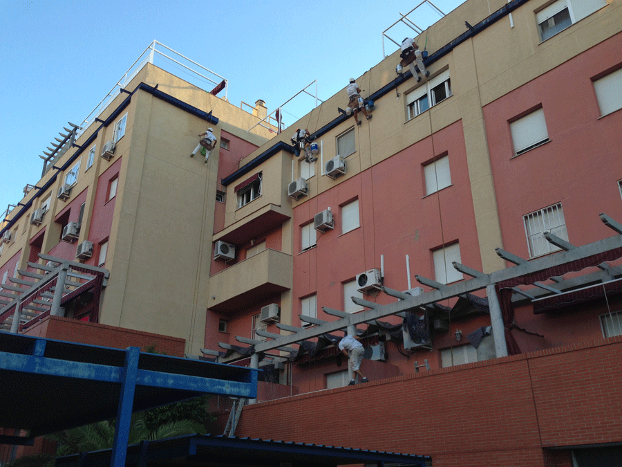 Rehabilitación de las fachadas de 4 bloques, patios interiores y zonas comunes, limpieza con agua a presion de las mismas, saneamiento y reparacion de las fisuras, tratamiento de fijación y posterior pintado, finalizando con la sustitución de las juntas de dilatación.