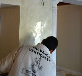 Preparación de la pared con fijación para el estuco, 4 manos estuco, última veteado y quemado más lijado y pulido cera.